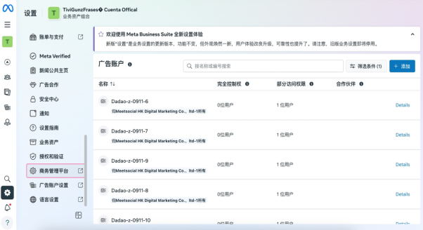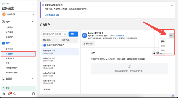 一旦由于各种各样的原因导致你原本在用的BM现在不使用了,你需要将原本的广告账户转移到一个新的BM(普通户需要一个全新的BM,三不限的户可以用老BM)。转移之后,原本BM内的广告账户都需要移除。具体操作如下: